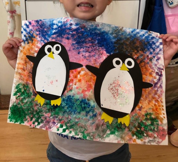 就黎3歲小朋友黏貼塗鴉畫-可愛既企鵝