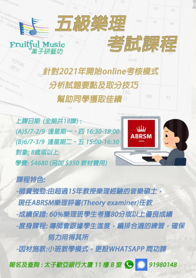 為預備今年9-10月應考英國皇家音樂學院五級樂理考生而設,由超過15年教授樂理經驗、音樂碩士畢業導師教授。