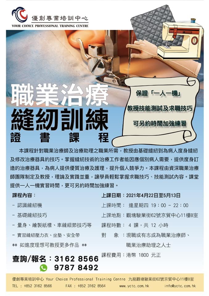 4月份職業治療縫紉訓練證書課程現正招生,