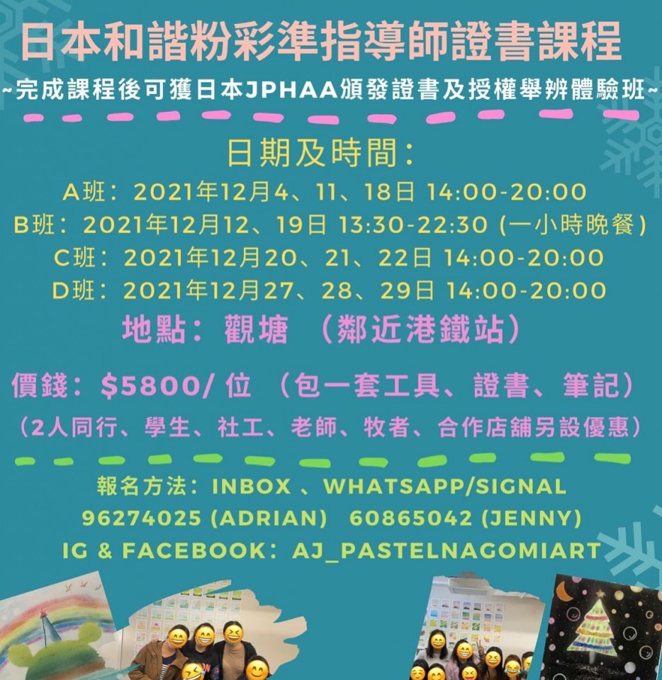 為推廣藝術治療及日本和諧粉彩,本店會以優惠價給予社福界人士/教育界人士報讀準指/正指導師課程,歡迎致電查詢
